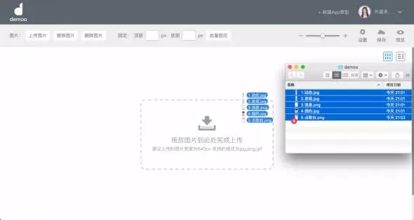 在設計工具中,我已經設計好了全民K歌5個主要頁面的圖并命名好保存在文件夾中,準備開始制作原型。如圖所示,Demoo支持批量導入圖片,將我需要的圖片全部選中,拖放到虛框內,即可完成圖片導入工作。導入后,就相當于你已經把app原材料都放到工作臺啦,之后操作起來就會特別方便。