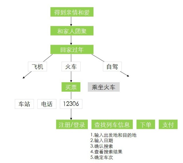 比如“訂票”是過年回家這個(gè)目標(biāo)的任務(wù),但是卻是12306注冊(cè)登錄、搜索車票、預(yù)定、支付任務(wù)的目標(biāo)。