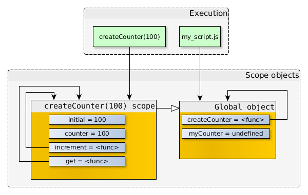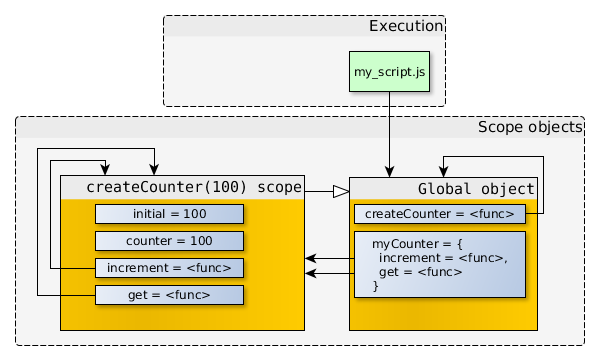 注意increment和get函數(shù)都存有指向createCounter(100) scope的引用。如果createCounter(100)沒有任何返回值,那么createCounter(100) scope不再被引用,于是就可以被垃圾回收。但是因為createCounter(100)實際上是有返回值的,并且返回值被存儲在了myCounter中,所以對象之間的引用關(guān)系變成了如下圖所示