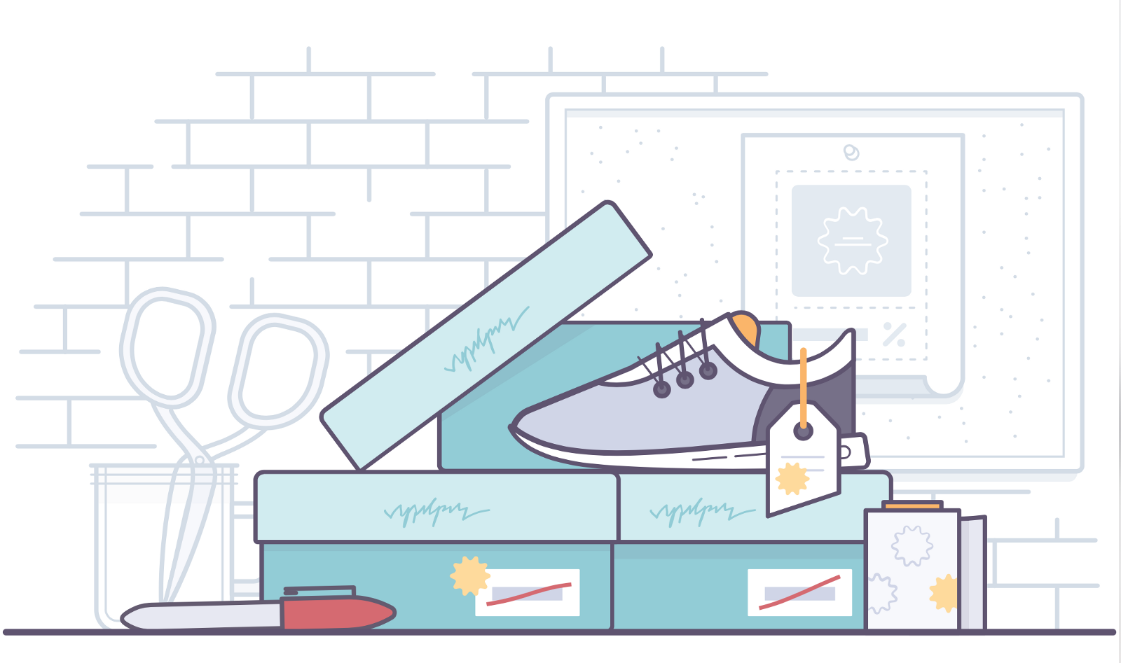 這個(gè)元素在線上和線下有相似之處。盡管我不認(rèn)為它是一類比喻,但在產(chǎn)品設(shè)計(jì)中我還是將它單獨(dú)拿出來說。比喻常用來展現(xiàn)觸動(dòng)人心的部分,那是一件事情或者一個(gè)行動(dòng)產(chǎn)生的積極感覺。不過,對(duì)于內(nèi)容傳遞給用戶的方式,團(tuán)隊(duì)更傾向于中立的寫實(shí)表達(dá)。不必告訴用戶我們的感受如何,只需簡(jiǎn)潔傳達(dá)信息。用插畫的專業(yè)術(shù)語來表達(dá)則是:我們只愿意通過繪制寫實(shí)狀態(tài)下的物品,來幫助用戶理解線上的內(nèi)容。當(dāng)然,談到產(chǎn)品時(shí),我們大多是在電腦上作畫,比如,你可以繪制20多個(gè)互相連接的空狀態(tài)頁面,來表達(dá)重復(fù)性。這也是我們?cè)跒橛脩魝鬟_(dá)內(nèi)容時(shí)增加的一種類比方式。比如下圖的例子,線上電子商務(wù)可以讓用戶通過優(yōu)惠碼輸入實(shí)現(xiàn)折扣,那么線下實(shí)體銷售折扣該如何表達(dá)呢?可能是一堆貼紙和帶著折扣價(jià)格的紅色標(biāo)記。我們能借助全新懷舊風(fēng)格的插畫為用戶帶來愉悅,同時(shí)還能保持中立,只是簡(jiǎn)單清晰的表達(dá)信息。
