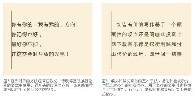 排版中重要的一條,是把應該對齊的部分對齊,例如每一個段落的字行對齊,就是把行的位置進行對齊使其一致的方法。行頭對齊是所有行均在行頭對齊的方法(圖5)雖說這種用法使得行尾不齊整,但方便文章的停頓部分換行,適用于散文、詩歌等表現韻味的文字版式。但是,對于編排長篇文章時,選擇左右對齊更能體現條理性。由于換行的位置都相同,閱讀行頭或換行的時候視線能夠平緩流暢地移動。