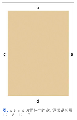 首先在書籍編排過程中,設定頁面四周的余白來安排頁面的排版。頁邊空白的大小不同,排版效果給讀者帶來的印象也會發生變化,因此需要適當地進行處理。雖然紙質書籍已經有了莫里斯所提倡的版面設定理論,但是這些理論并不適合于顯示在硬件設備上。因此我們需要根據不同的媒體特點來進行處理。如圖(2) 有顏色的部分是版面,abcd版面標準的設定通常是按照1:1.2:1:1.7的比例來進行設計。