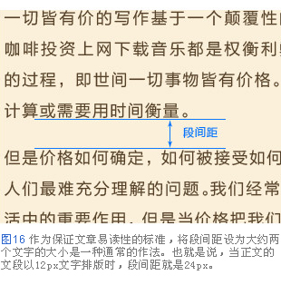 作為保證文章易讀性的標準,將段間距設為大約兩個文字的大小是一種通常的作法。也就是說,當正文的文段以12p文字排版時,段間距就是24px。當然,這個標準也并不是絕對的,有時候也可以通過刻意地設定狹窄的段間距,給讀者帶來內容緊湊的印象。