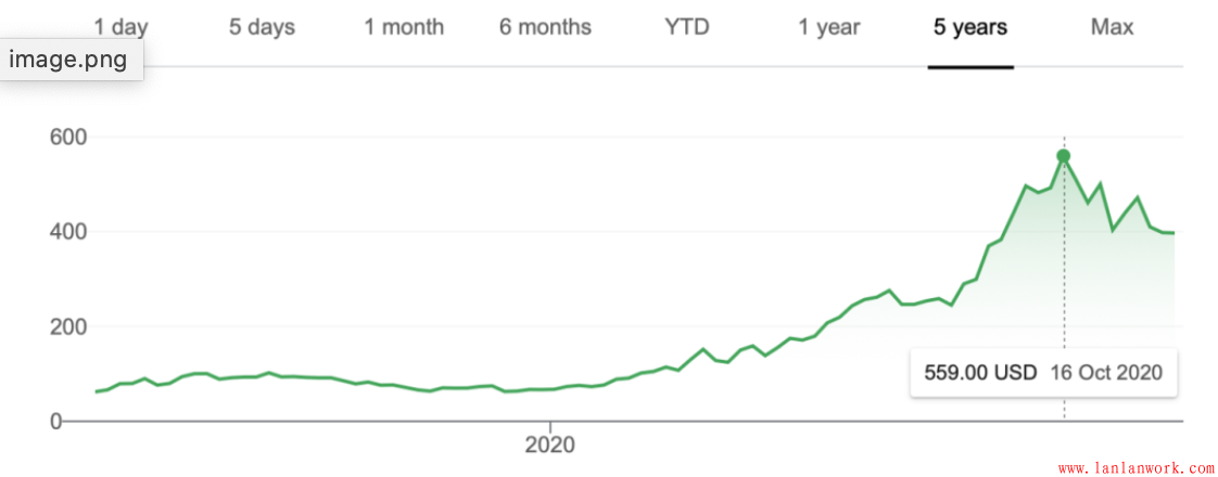 zoom視頻的股價走勢圖,一年內股票價格增長了500%