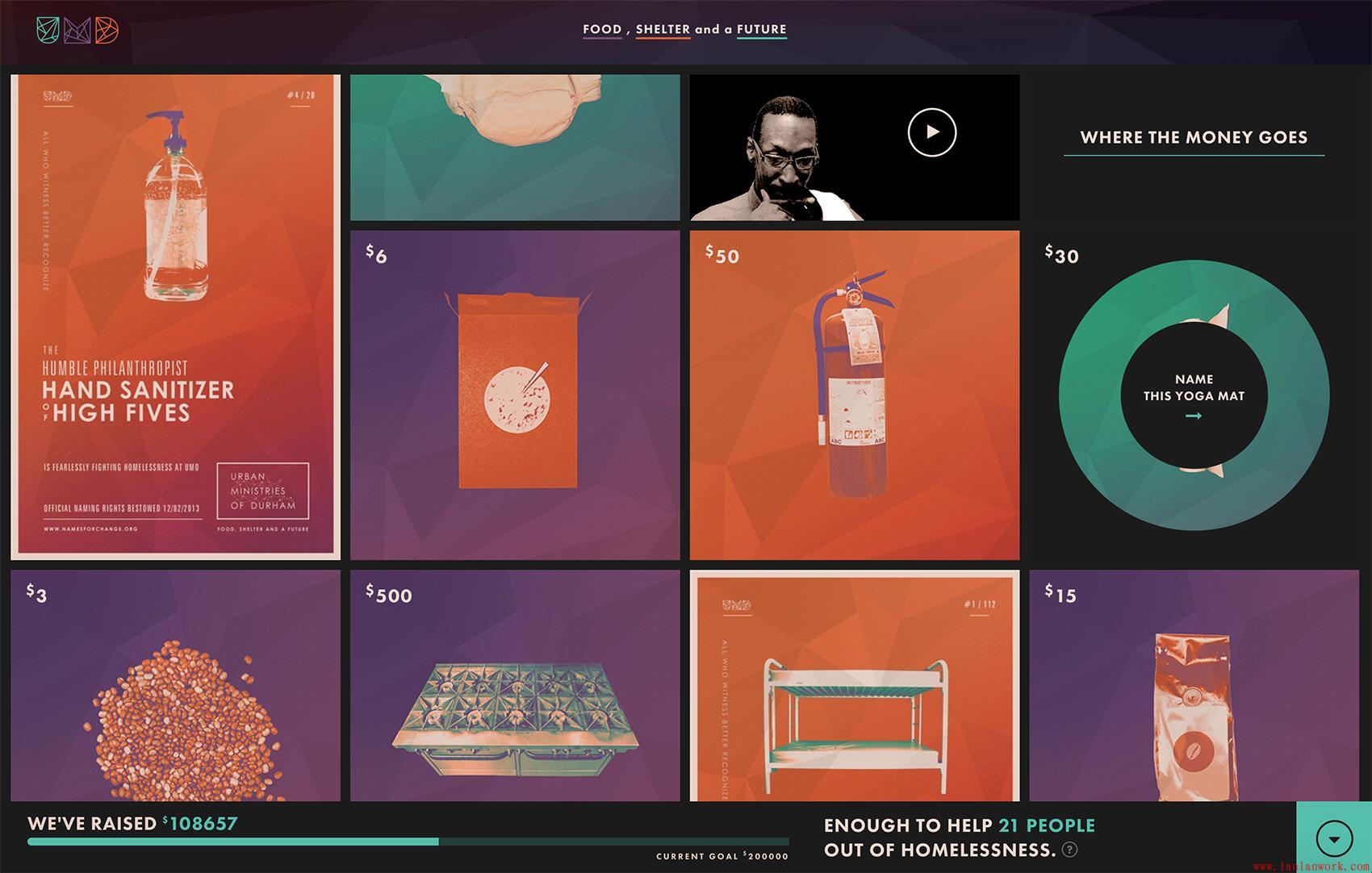 然而,所選擇的音調有助于克服該站點意義的潛在困難之一。為襪子或衛生棉條等日常用品籌款并不足以讓自己出售,因此該網站的激進圖形基調提高了日常用品的感知價值,同時建立了必要的基礎組織結構。