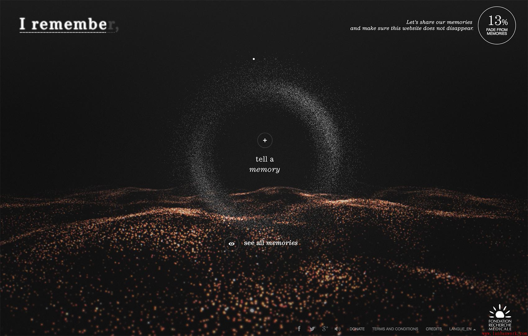 對于I Remember網站,主界面(動畫)立即引人注目,因為它邀請互動。雖然動作和界面是功能性導航工具,但視覺設計師利用這些元素的潛在損失作為傳達網站潛在使命的方式:阿爾茨海默病。就像組織為其籌集資金的患者的褪色記憶一樣,如果沒有積極的互動,網站就會慢慢消失。