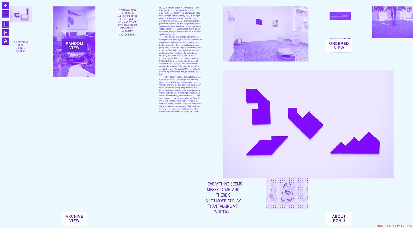 在大多數創意設計工作室的作品集中,作品沒有按層次組織,因為每個項目都是獨特的,并且被認為同樣重要Ro / Lu網站的設計創造了一個動態的構圖,每次訪問都有不同程度的驚喜,并鼓勵觀眾調查工作室的廣泛組合。因此,設計工作室的折衷,跨學科性質由內容的隨機顯示。