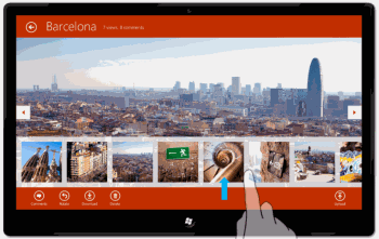 無論在iOS還是Windows中,這兩個手勢在很多時候都被用作放大或縮小內容對象的尺寸。不過對于Metro應用來說,它們還可以通過Semantic Zoom來實現內容層級間的導航。用戶可以捏合某個內容對象,來進入它所在的相關內容組。不過,當用戶正在以全屏模式瀏覽單張相片的時候,捏合與張開的手勢還是會被用來調整圖片的尺寸。