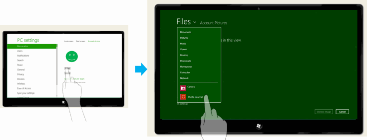 如上圖所示,用戶在PC Settings界面中點擊“瀏覽”,以更換頭像圖片。由于我們的相片日志應用支持文件選擇器契約,所以在接下來的文件選擇界面中,就會看到應用名稱出現在列表當中,用戶可以選擇該應用當中存儲的相片作為新的頭像。