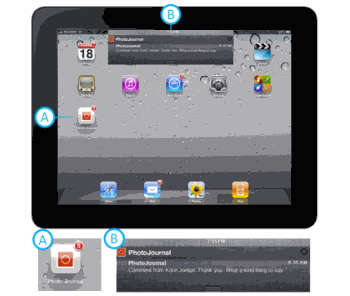 iOS 5引入了通知中心,使得所有的通知信息都可以迅速即時的在界面頂部呈現出來,用戶可以將提示消息展開為完整的通知中心面板,查看所有的消息。另外,在iOS當中,應用圖片側上方的數字標識也可以讓用戶了解到該應用當中的內容更新數量。