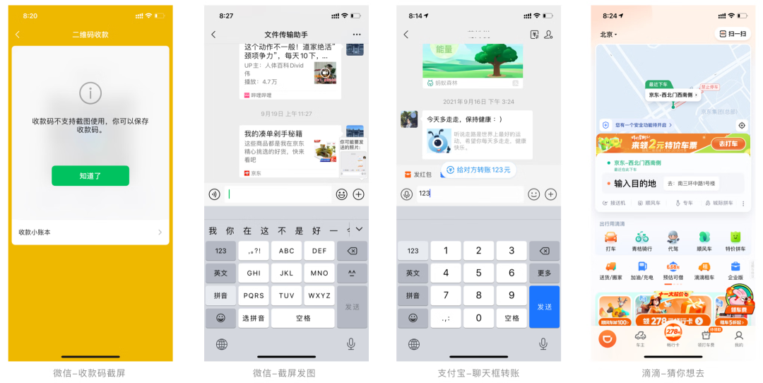 舉例:1)微信在用戶收款碼頁面中,用戶只要進行了截屏操作,一般都是想保存二維碼,所以微信在捕捉到用戶的截屏操作后,會自動觸發(fā)保存二維碼彈層;2)用戶剛進行截屏操作后,進入微信聊天頁點擊「+」,會自動浮現(xiàn)截圖,方便用戶直接發(fā)圖;3)支付寶聊天窗中,輸入了數(shù)字后會自動觸發(fā)轉(zhuǎn)賬的操作;4)滴滴中會記憶用戶過往目的地,并根據(jù)重復(fù)記憶結(jié)果,在用戶下次進入時,在目的地輸入框中浮窗展示目的地,簡化了目的地搜索過程,使重復(fù)行為變得更加簡單。