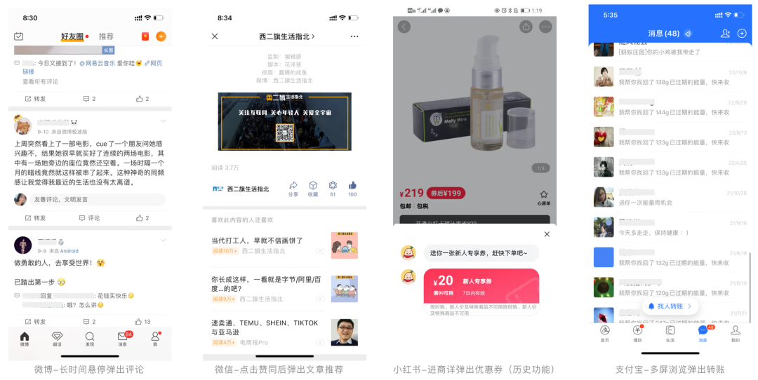 舉例:1)微博長時間懸停引導(dǎo)評論,當(dāng)用戶在某條內(nèi)容上停留一定的時間(大約4秒),系統(tǒng)會判斷用戶對該內(nèi)容有興趣,從而彈出‘評論框’,引導(dǎo)用戶進行評論;2)微信訂閱號在用戶對某條內(nèi)容點擊“贊同”后,系統(tǒng)會判斷用戶對當(dāng)前內(nèi)容較為認(rèn)可,會向下彈出更多文章推薦,引導(dǎo)用戶閱讀;3)小紅書進入商詳后會彈出優(yōu)惠券,通過權(quán)益激勵引導(dǎo)用戶購買;4)用戶在支付寶消息列表中滑動瀏覽多屏后,會出現(xiàn)“找人轉(zhuǎn)賬“的提示,點擊后進入朋友列表的純凈模式(去掉類服務(wù)通知等跟轉(zhuǎn)賬無用的列表),提高了用戶的尋找效率。