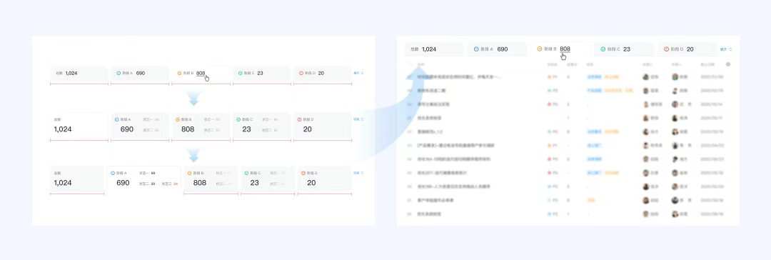 體驗設(shè)計師在一些項目中嘗試了將數(shù)據(jù)可視化看板與Tab標簽頁的融合,這就形成了具有Tab切換功能的數(shù)據(jù)看板,用戶在查看概覽數(shù)據(jù)的同時也可以通過點擊切換查看各階段/狀態(tài)下的詳細數(shù)據(jù)。