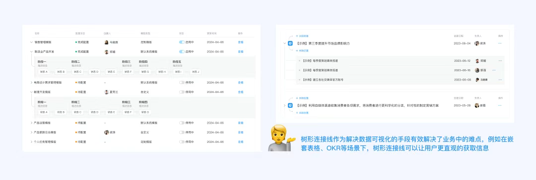 樹形連接線作為一種解決數(shù)據(jù)可視化的手段有效解決了業(yè)務(wù)中的難點,同樣設(shè)計團隊也將其拓展到了更多適用場景,幫助用戶提升信息查看和操作效率。