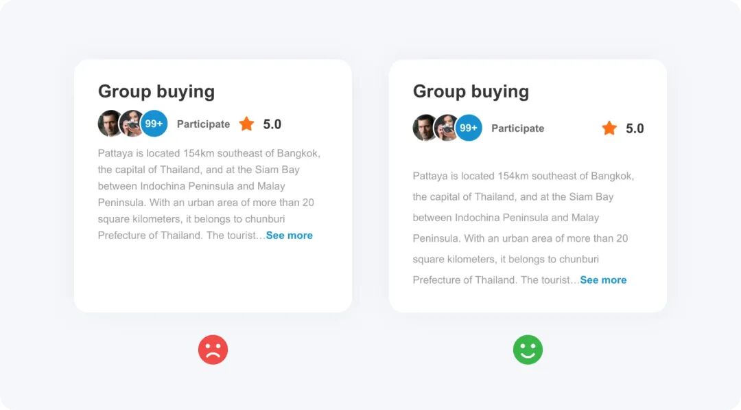 一個(gè)卡片內(nèi)通常會(huì)包含圖片、標(biāo)題、詳細(xì)介紹及行動(dòng)按鈕等元素,這些元素需要以聚焦的形式去呈現(xiàn),以幫助用戶快速掃描內(nèi)容。當(dāng)文本內(nèi)容較長、展示的信息過多時(shí),不利于用戶快速掃描,導(dǎo)致用戶無法在第一時(shí)間快速感知到產(chǎn)品想要展示的、或用戶想要知道的信息,很容易被用戶過濾。
