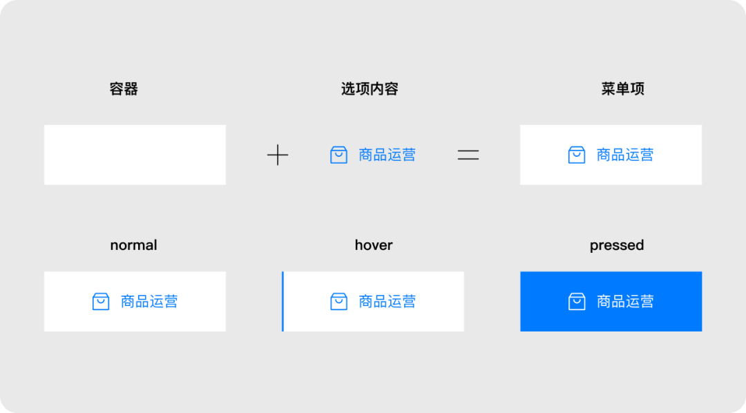導(dǎo)航菜單是由多個(gè)菜單項(xiàng)集合組成的。菜單項(xiàng)由容器+選項(xiàng)內(nèi)容(圖標(biāo)+文字或文字)組成,交互行為是點(diǎn)擊菜單熱區(qū)后跳轉(zhuǎn)到相應(yīng)目標(biāo)頁面。
