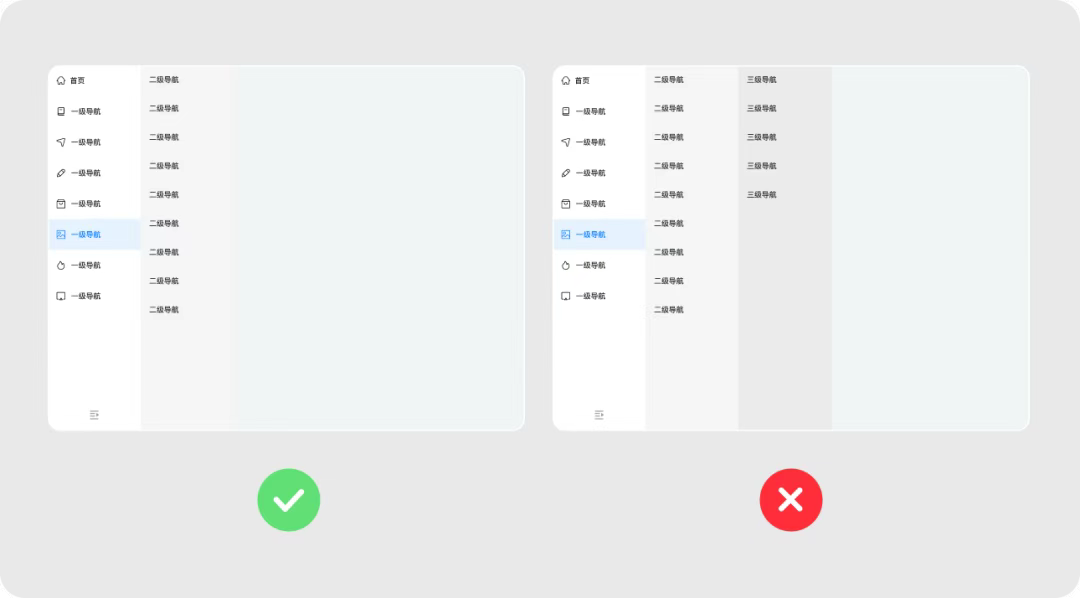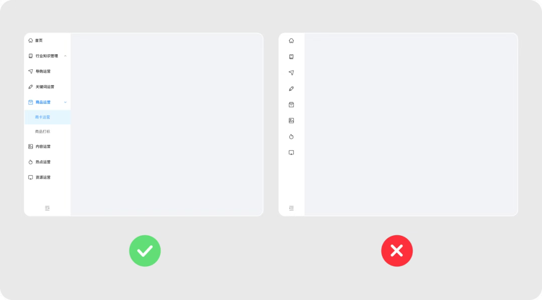 縱向?qū)Ш街糜陧撁孀髠?cè),垂直延展,選項(xiàng)優(yōu)先級(jí)由上而下遞減。用戶可以在不同選項(xiàng)中快速切換,操作效率較高;縱向空間可以容納更多菜單選項(xiàng),并且可以延展二級(jí)分類。拓展性比較高,適合專注操作的后臺(tái)類產(chǎn)品。