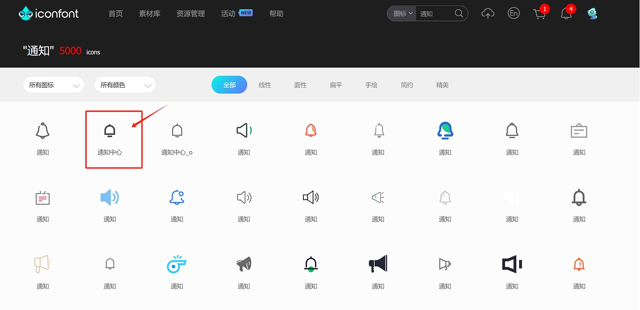 我就拿最常用的阿里巴巴圖標庫,打開網址,找通知圖標,直接下載第一頁,第 1 排第 2 個: