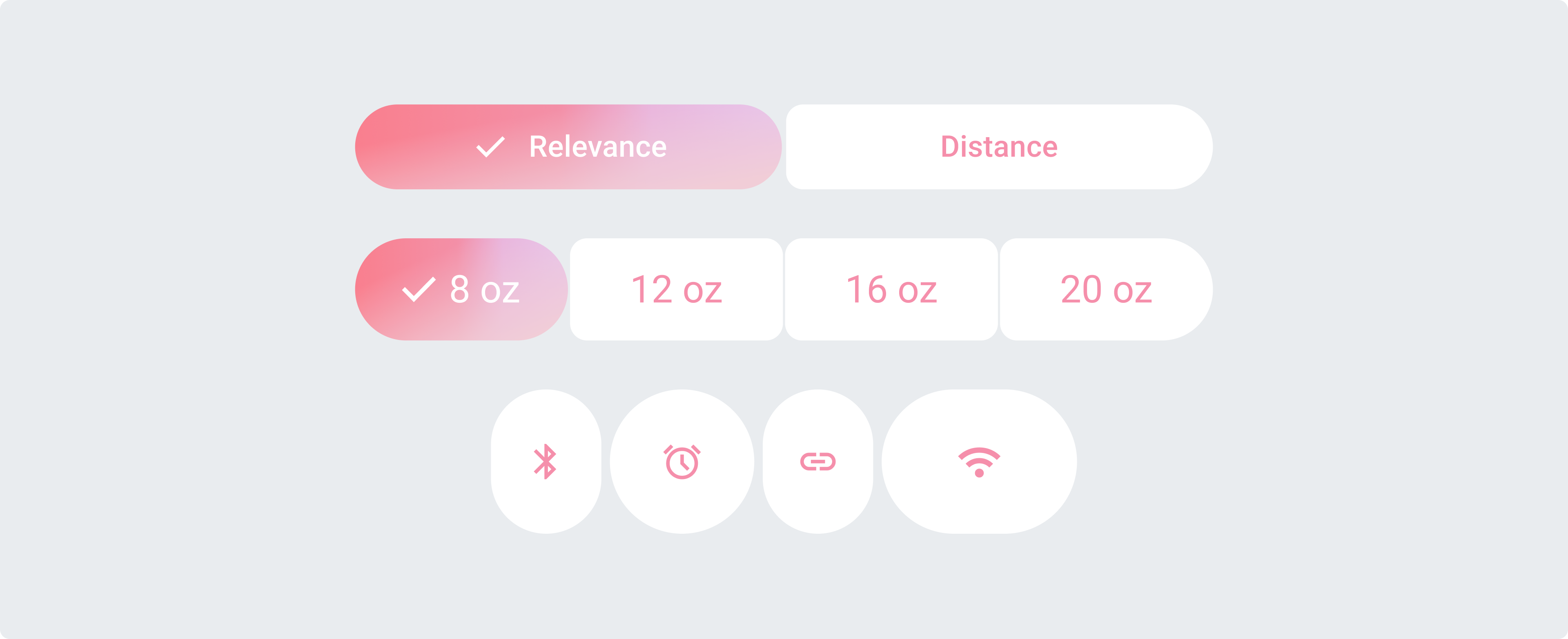 如果按鈕內容彼此關聯且可選,請使用鏈接按鈕組。在購物應用中,鏈接按鈕組用于選擇商品的容量,
