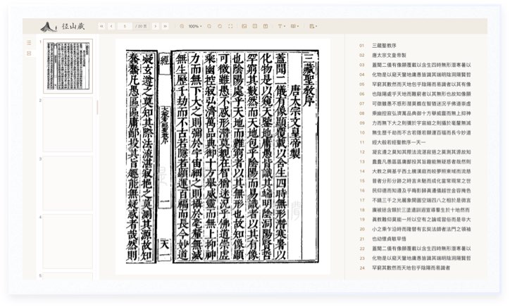 閱讀和操作區域分開,所有按鈕置頂集中排布,操作區盡量簡化,閱讀時減少干擾。左側有目錄和縮略圖切換。